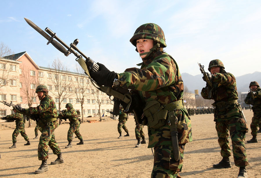 1月19日,从韩国7所大学中选拔出的60余名女性预备役军官,和男性预备军官们一起在韩国京畿道城南市进行训练。