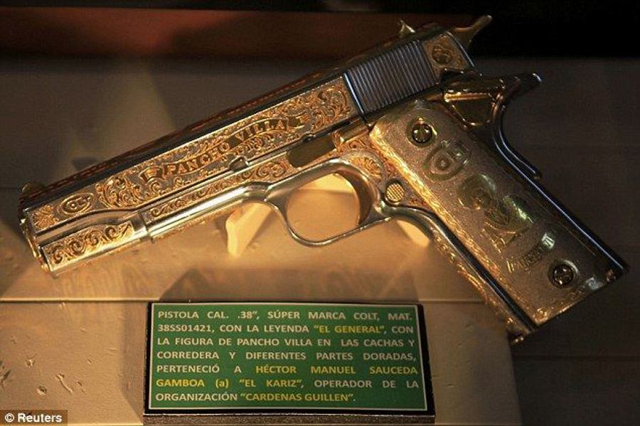 墨西哥军事博物馆展出被捕毒枭黄金配枪