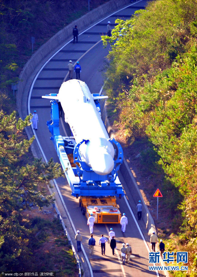当地时间2012年10月24日上午,韩国首枚运载火箭“罗老”号正在被转移至发射台。教育科学技术部长官李周浩22日举行记者会表示,确定将于26日发射“罗老”号。(来源:CFP)