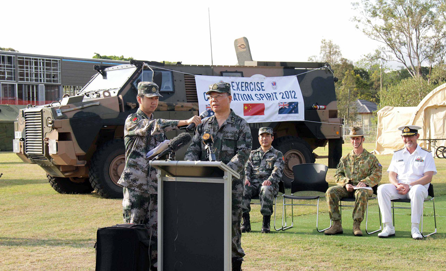 10月31日下午,在澳大利亚加里玻利军营举行的“合作精神—2012”中澳新三边人道主义救援减灾联合演练闭幕式上,中国军方观摩团团长任海泉中将致辞。新华社记者李宣良摄