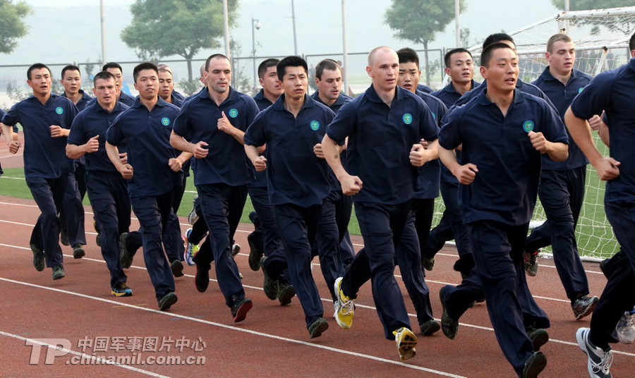 进行基础课目训练。中国武警与俄罗斯内卫部队特战队员混合编组,进行2000米跑体能训练。