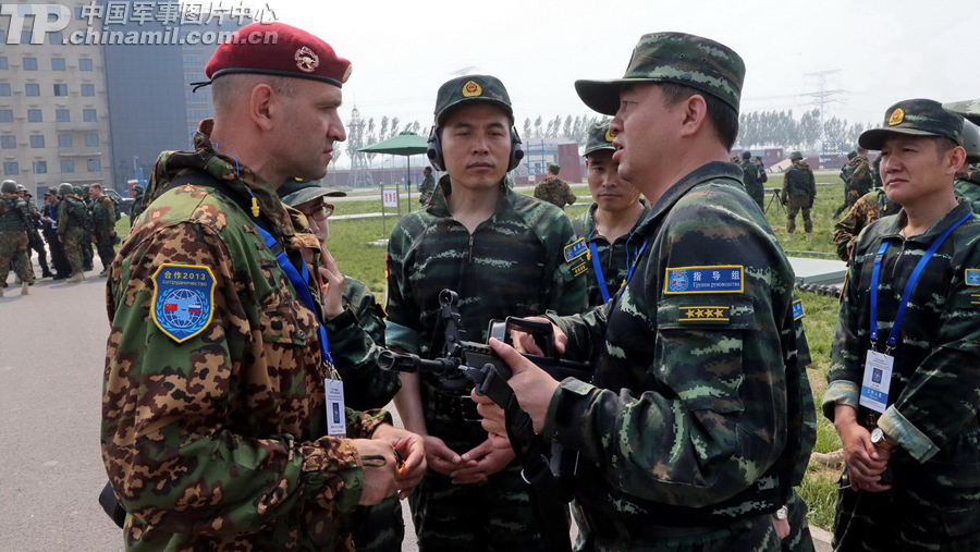 中俄两军教练员交流射击经验。