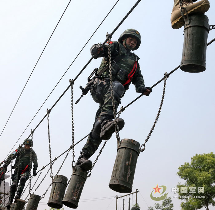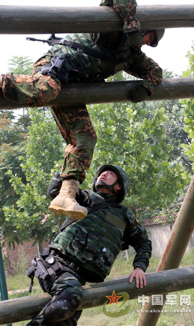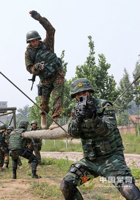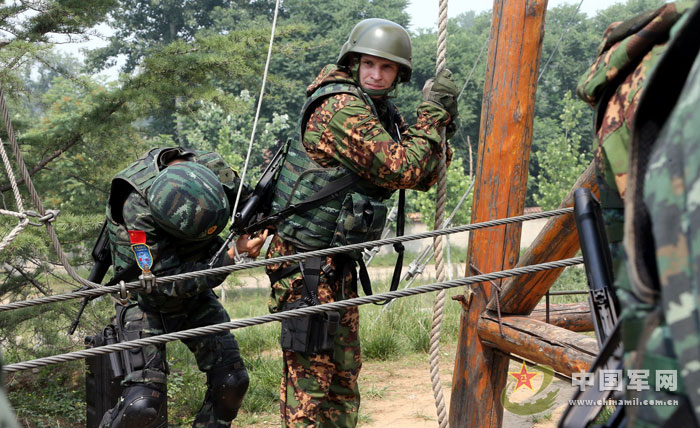 图为中俄两国参训特战队员训练圆木组合的情景。解放军报记者