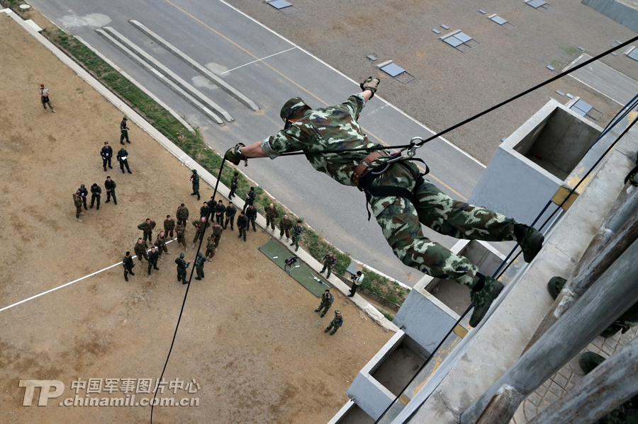 方特战队员在攀登训练中飞身下楼的情景。解放军报记者