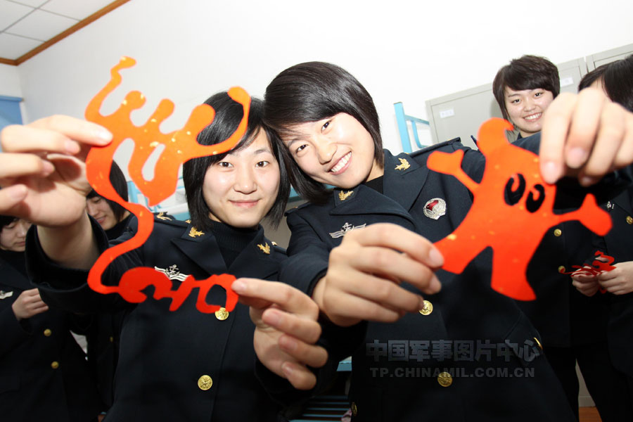 4月7日,北海舰队青岛保障基地某话务连女兵们争相展示剪纸“海宝”。世博会脚步一天天临近,该话务连官兵们一起自学剪纸艺术,用漂亮的剪纸世博会会标和形态各异的世博会吉祥物“海宝”,为世博会喝彩祝福。