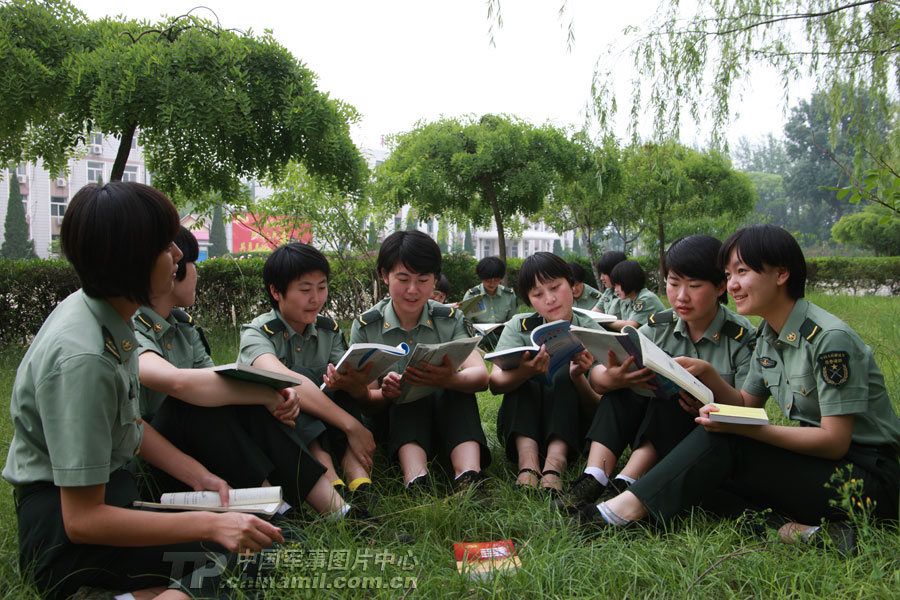 她们曾在陆航部直属单位科学发展观理论测试中名列前茅,是在党的创新理论指引下成长起来的青年官兵。图为中队理论学习小组在学习新党章。