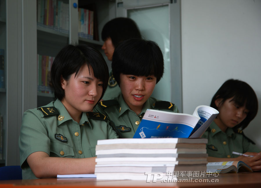 毕业于山东科技大学的新兵党员孟冲(左二),正在为参加军校招生考试的下士班长杨华辅导功课。