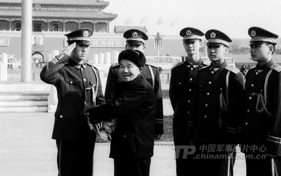 1993年4月9日,在天安门广场的国旗下,江厚法把他与老伴亲手缝制的100多双鞋垫,庄重地交到国旗卫士们的手中。