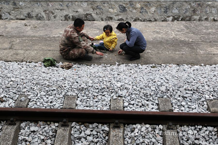 每天一家人一起巡完线后,都会在铁路边用路边的石头下跳棋,在深山中找乐趣。