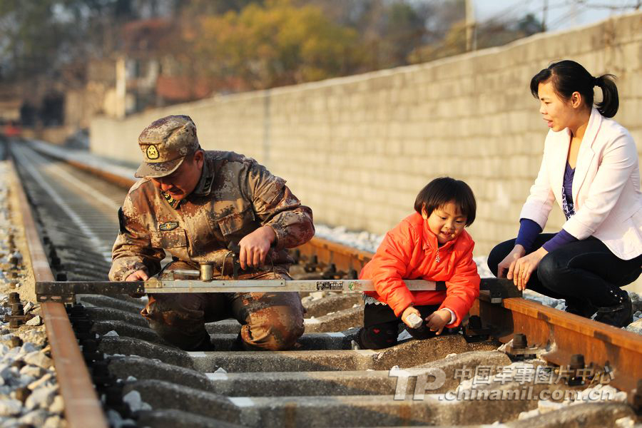 空闲的时候,妻子覃颖就会带着女儿一起来到铁路边,帮助他做些力所能及的事。凌耀南 摄