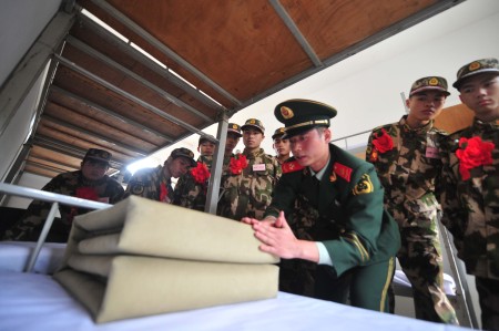 12月10日,广西公安边防总队新入伍的战士观看班长演示整理内务。