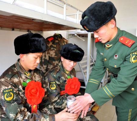 12月10日,内蒙古公安边防总队的老战士为刚刚到来的新兵端上一杯热水。