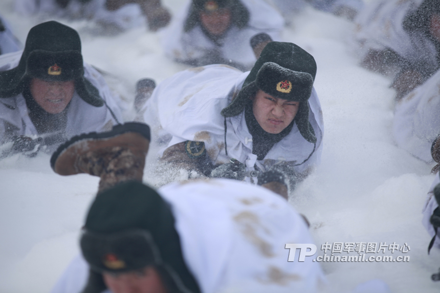12月19日,黑龙江省军区某边防团新战士在茫茫雪野进行战术训练。特约通讯员