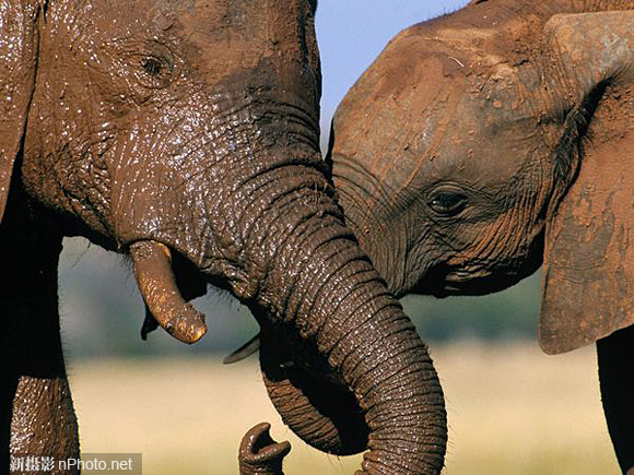 在经过赞比西河干涸的河床时,小象亲昵地用鼻子蹭着母亲。