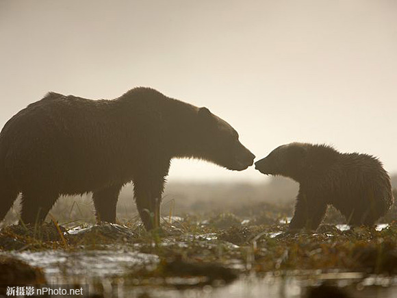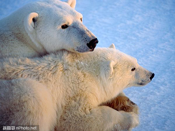 橘红色的阳光斜斜地照在北极熊母子身上。