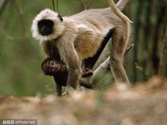 在这张由遥控35毫米照相机拍下的照片中,Bandhavgarh国家公园内的一只小长尾叶猴紧贴着挂在妈妈的胸口。摄影师Michael Nichols安放这些相机本来是用来抓拍老虎的行踪,然而灵活的长尾叶猴每天都会触发照相机的红外光束几千次,浪费了大量的胶卷,因此他不得不重新定时,将相机工作时间调至“老虎时间”——老虎准备夜间觅食的傍晚时分。