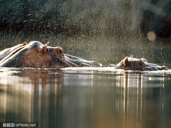 河马妈妈和小河马在“河马冲浪之地”乘凉。栖息于此的河马习惯于在水里游泳,在摄食期间往返“冲浪”,卢安果国家公园故得此美誉。