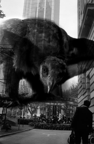 在今天,仍然栖身于暗房展开影像的制作是一种坚持,也是一种奢侈。而通过暗室中的影像再造更是一种精神欢悦,虽然这种制像方式从摄影史来看已属“古老”。史晹的照片得自于现实,却又通过暗房的制作来获得超现实的景象。其实,这些翻新了我们的都市想象的影像,所幽幽提醒的是现实的不可捉摸与都会的叵测。这些影像深入到我们的潜意识深层,进而搅动并且勾起隐藏于我们潜意识中的各种意识杂物,唤醒有关现实的新的意识。超现实主义所追求的是“痉挛之美”,而史晹的影像,经由这么一种影像的、也是现实的重组,向我们提示了超越了“痉挛之美”而引发了“精神痉挛”的新的图像和新的现实意识。