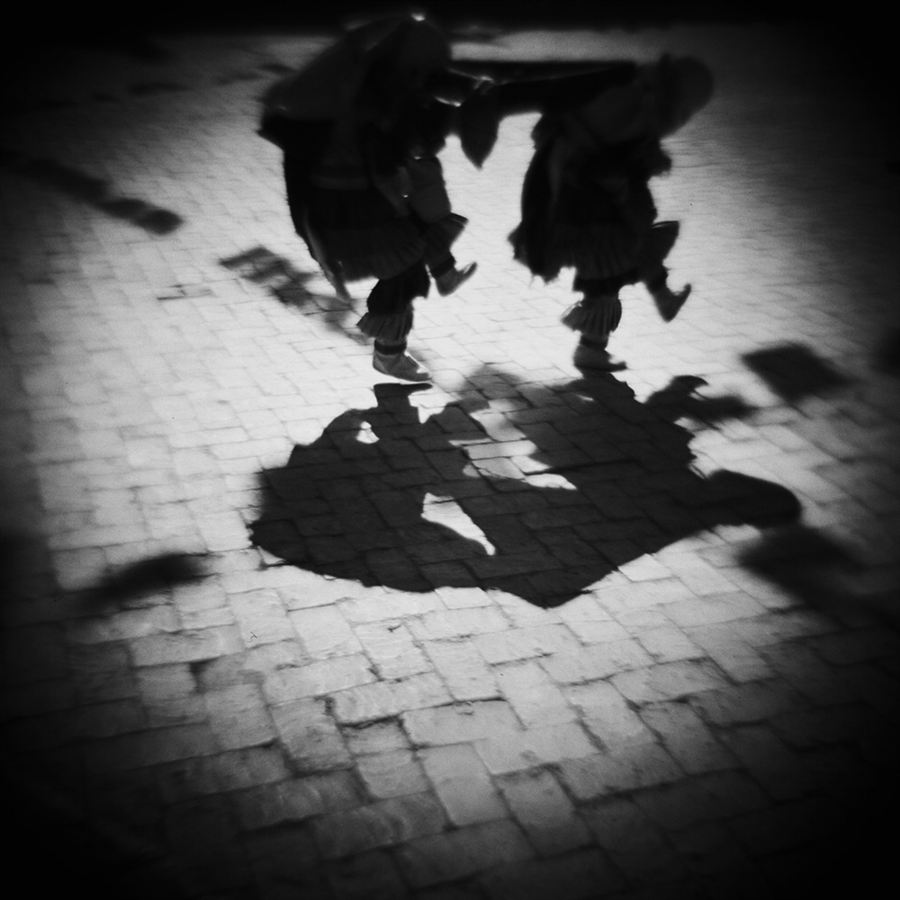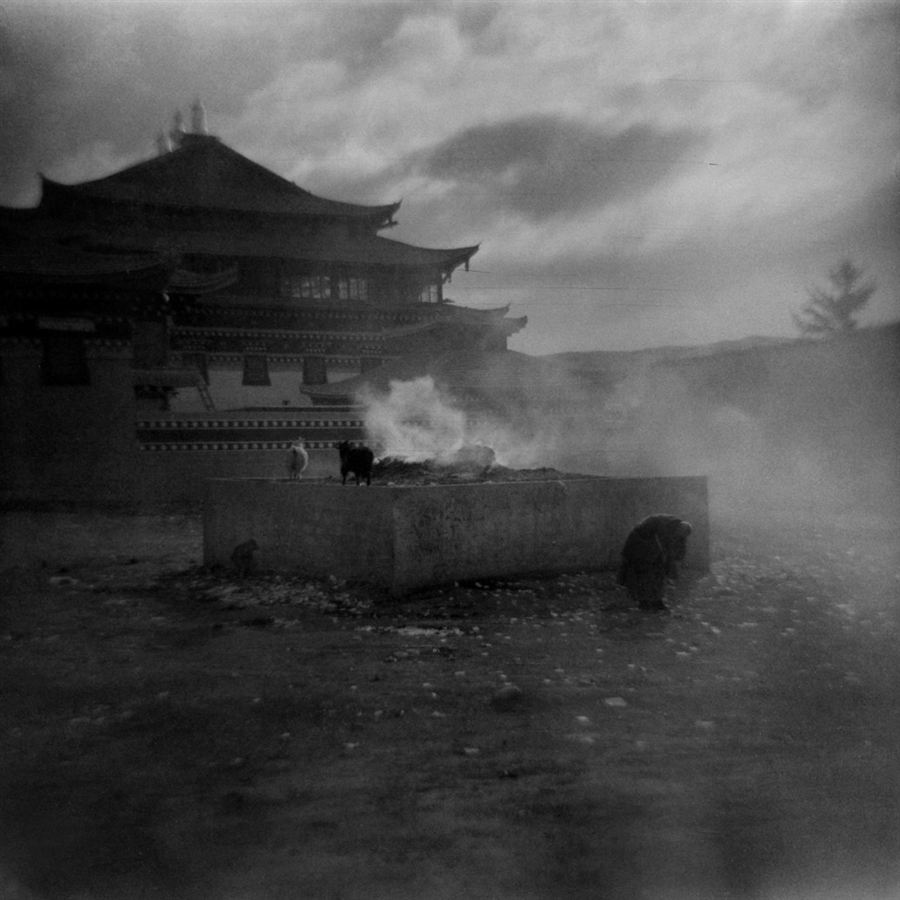 “他方”何在?这组风格统一形式整饬的照片显现的是藏区抑或他处?这些模糊不清的影像,这些独行道途中的人们,这些幽暗深沉的庙宇、山色,并没有向我们显现出清晰明确的现实讯息。与摄影者所言正好相反,他并没有通过一组陌生而疏离的影像将我们带向他方,而是引入摄影师的内心:他的好奇,他的疑惑,乃至他努力为摆脱这种内在焦虑而不断的游走与持续的观看——即使这观看也止于疏远地瞟瞥而不是纪实摄影一向推崇的那种冷峻的凝视。