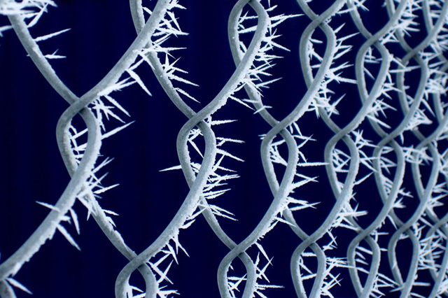 22. 这是对无所不及的春季晚霜一次别出心裁的展示。这张特别的照片摄自一处建筑工地,霜冻的围栏,背景是一个大型蓝色金属垃圾箱,拍摄时间为2011年的3月底。(摄影:Sara Worsham)