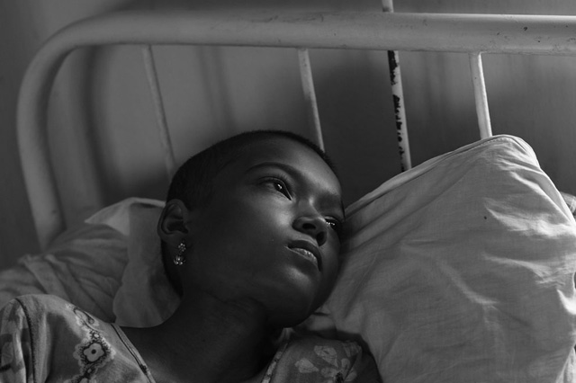 35. 加尔各答的特蕾莎修女结核病院里,罹患慢性病的13岁的Pinki Kundu正在接受治疗。她目前用的是1类药物治疗,疗效不错。我拍摄她的那天,她信心满满,认为自己很快就能回到父母的身边了。(摄影:Saibal Gupta)