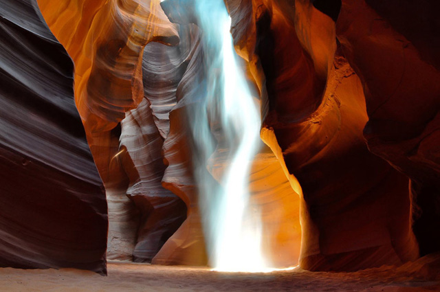 41. 这幅照片摄于亚利桑那州佩吉附近的上羚羊谷,它展现了沙子扬到空中,与太阳光线狭路相遇的奇妙效果。(摄影:Angiolo Manetti)