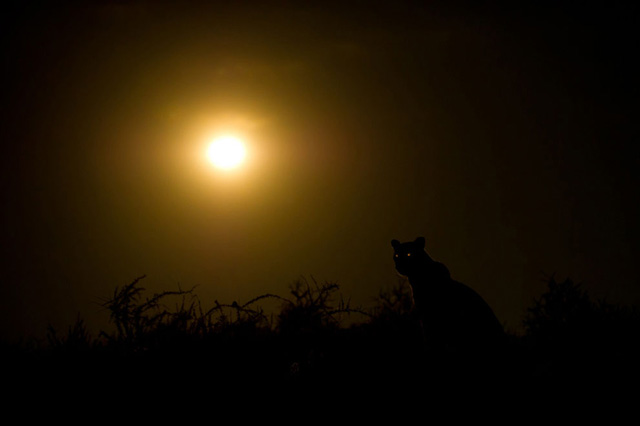 45. 去年一年,我一直在试图跟踪一头带着幼崽的豹子,我与它们共度了许多个夜晚。她没安追踪装置,因此每当我找到她时,就尽量与她呆的时间长一些。在这个特别的夜晚,一头棕色鬣狗偷走了她的猎物(一头跳羚),她坐在岩石架上,月亮在她身后升起。我用手电筒照亮了她的眼睛,让画面看上去愈加神秘。(摄影:Hannes Lochner)