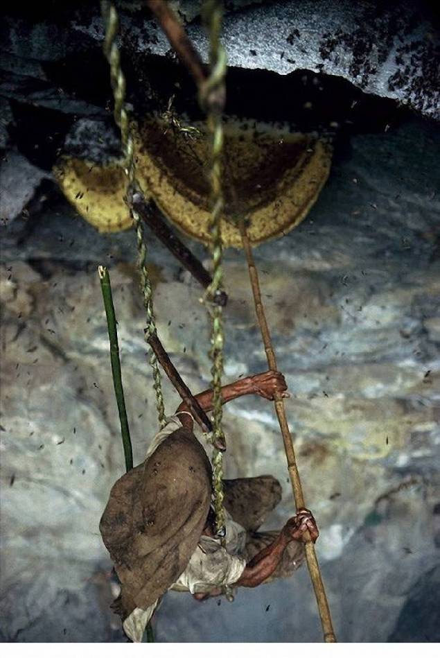 尼泊尔中部喜马拉雅山区深山中的采蜜人。