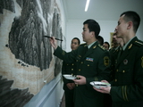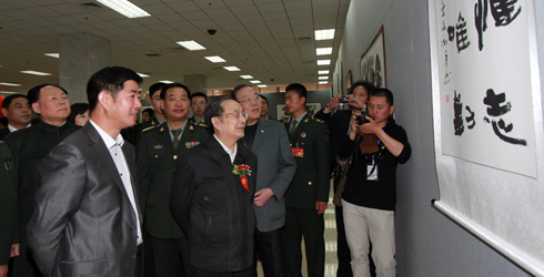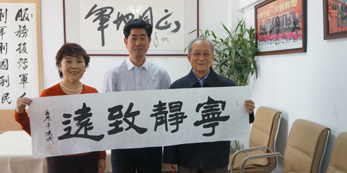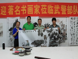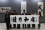 军地书画研究院张成秘书长,雅安市委常委宣传部部长姜小林,副部长、市文明办主任李蓉和《秋园高士行吟图》的画家李晓柱、李晓军、李晓明、李晓松合影。