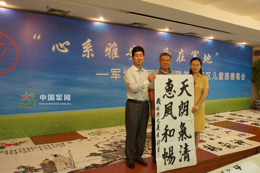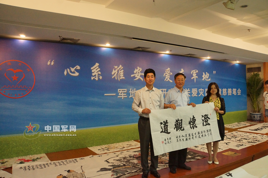 军地书画研究院张成秘书长和雅安市委宣传部副部长、市文明办主任李蓉接收海航原副参谋长李彰将军墨宝。