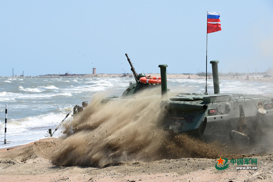“里海赛马”短程赛中在沙滩赛道高速机动的俄罗斯海军陆战队80式轮式步兵战车。