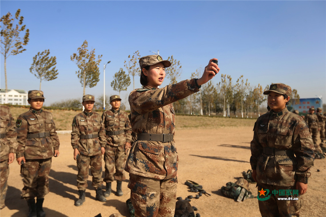 秦洋给南开大学入伍的贾岚君示范投弹动作。