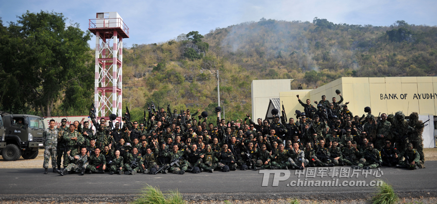 12月20日,“突击-2013”中泰陆军特种部队反恐联训圆满落幕,双方参训队员集体合影。