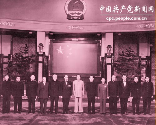 1954年粟裕(右5)陪同毛泽东(右7)、周恩来(右6)、林伯渠(右9)会见苏联顾问。
