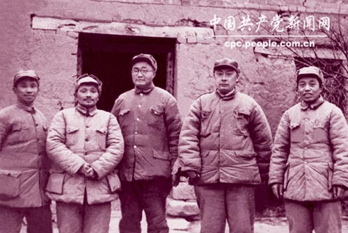 1948年12月17日,淮海战役总前委在华野指挥部蔡凹村第一次开会,左起:粟裕、邓小平、刘伯承、陈毅、谭震林。