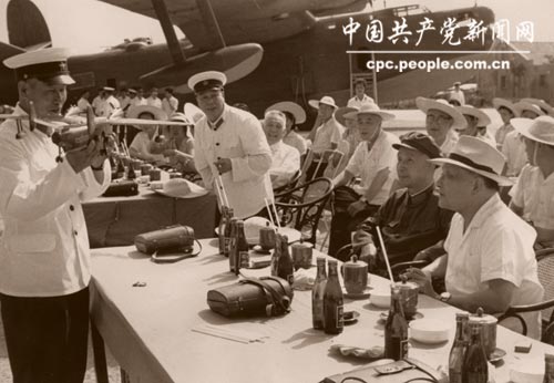1979年7月,粟裕在青岛与邓小平一起观看海军北海舰队水上飞机表演。
