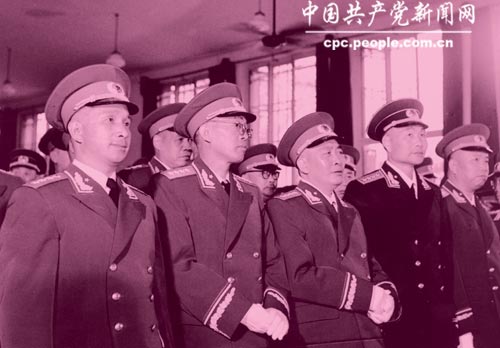1955年9月授衔典礼,前排左1粟裕、2黄克诚、3谭政、4萧劲光、5王树声。