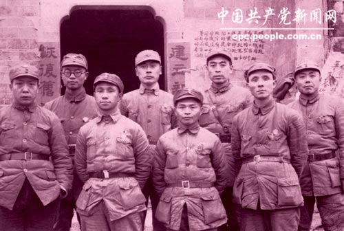 1939年3月在新四军军部合影,左起李一氓、袁国平、粟裕、陈毅、王集成、周恩来、邓子恢、项英。