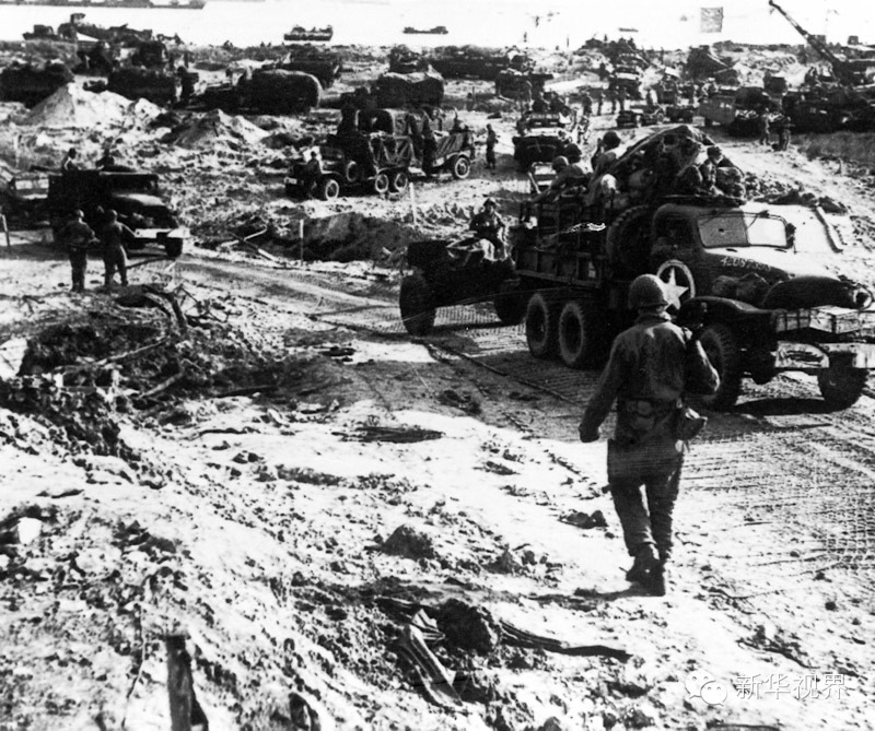 这张历史照片显示的是1944年6月6日美军士兵登陆诺曼底时的情景。新华社发