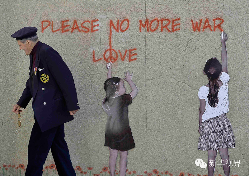 在法国诺曼底海岸,曾经参加过诺曼底登陆的英国老兵保罗·巴特勒走过一面写着“请不要再有战争”的墙(2014年6月4日摄)。新华社/路透
