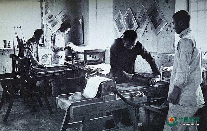 1943年,在平山县曹家庄用自己改装的手摇石印机印刷《晋察冀画报》。(资料照片)