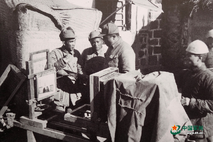 1944年11月,沙飞(左一)向来社参观的美军观察组人员介绍照相制版情况。(资料照片)