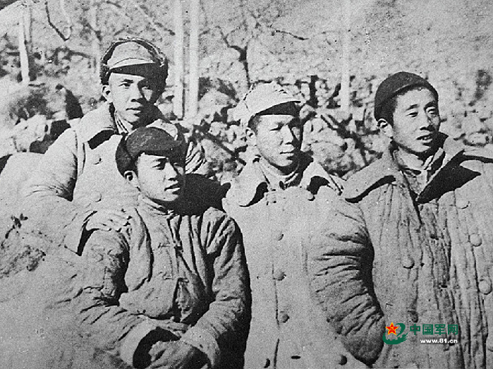 晋察冀画报社的主要领导——主任沙飞(左一)、政治指导员赵烈(左二)、副主任石少华(左三)、副主任罗光达(左四)在碾盘沟村合影。