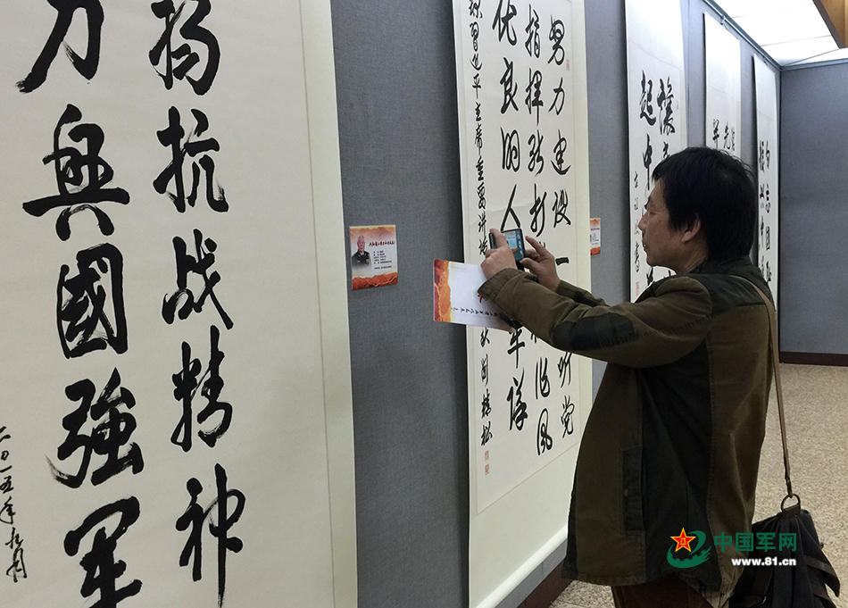 10月21日,“抗战精神:不屈的国魂”——首届共和国上将书画作品展现场,来宾欣赏作品。
